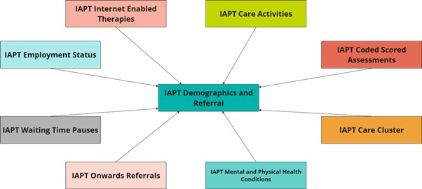The IAPT dataset is comprised of several tables (i.e. individual datasets). These constituent tables flow from NHS England to UK LLC grouped into 9 themed tables capturing patient demographics and referral, care activities, care cluster, scored assessments, employment status, internet enabled therapies, mental and physical health conditions, onward referrals and waiting time pauses. See Availability in the UK LLC TRE below for more detail.